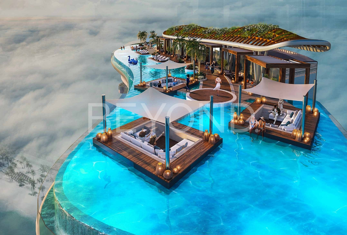 На крыше ждут еще более захватывающие развлечения. Три панорамных бассейна, расположенных на вершинах башни, позволят насладиться захватывающими видами и расслабиться в окружении роскоши. А для деловых встреч и работы предусмотрены плавучие платформы, предлагающие уникальную атмосферу и великолепные возможности для продуктивной деятельности.