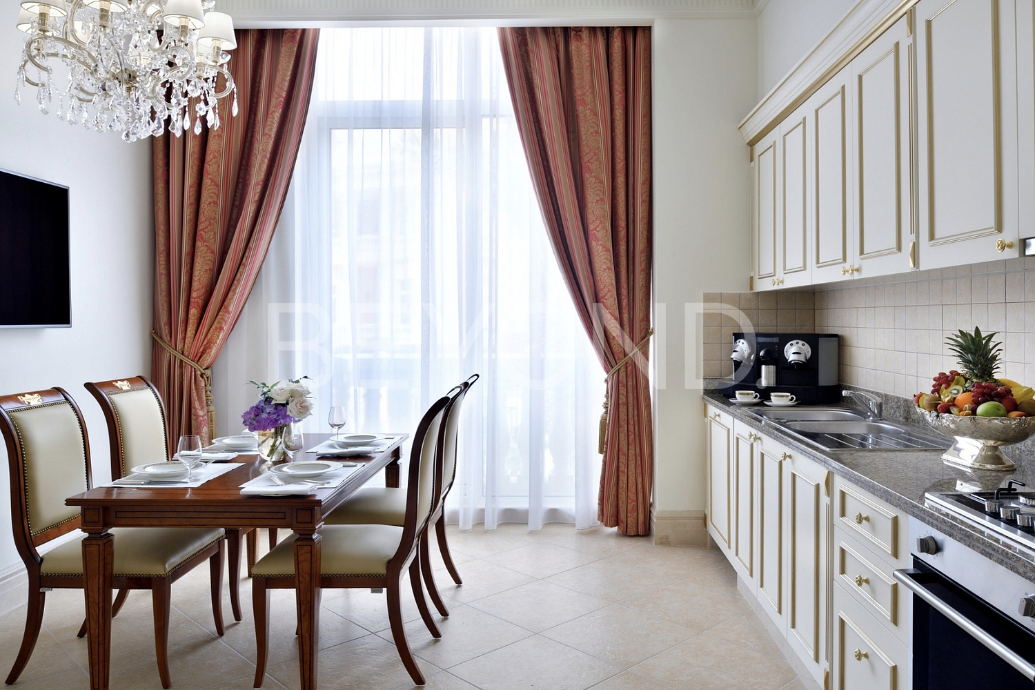 Просторная гостиная, объединённая с обеденной зоной, украшена изысканной лепниной. Панорамные окна наполняют пространство светом и воздухом, а хрустальные люстры, переливаясь в лучах солнечного света, создают атмосферу роскоши и величия.