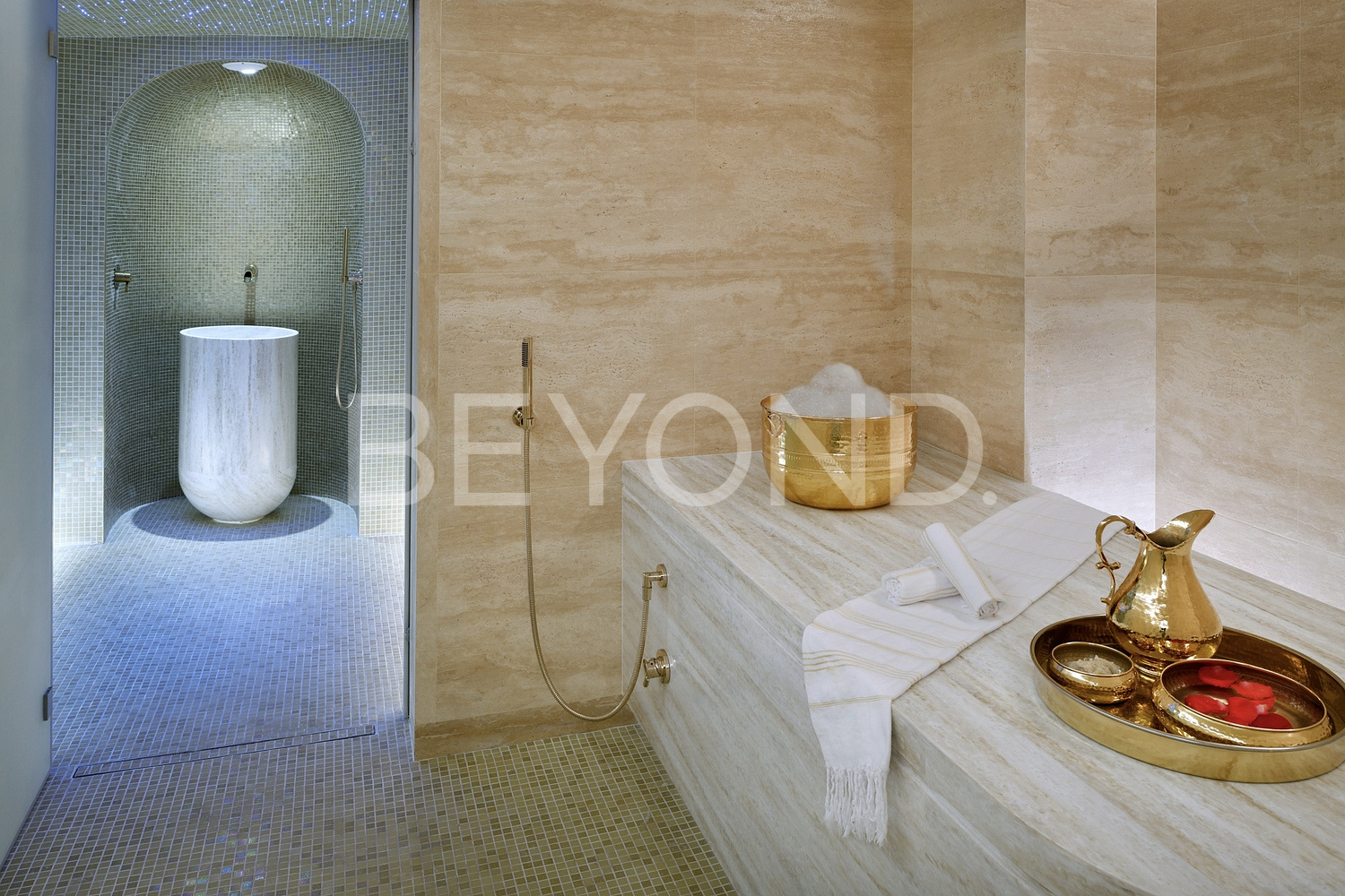 Эта полностью меблированная резиденция оснащена собственным лифтом, комнатами для водителя и горничной, гаражом, лаундж-зоной с отдельным входом, гардеробными, тремя гостевыми комнатами с индивидуальными ванными, и просторной спа-зоной. В спа-зоне предусмотрены хамам, душевые, спа-ванна, массажная зона на два стола и мраморный стол для спа-процедур.