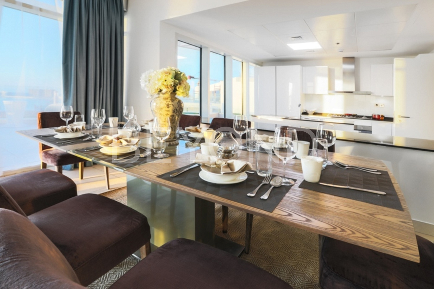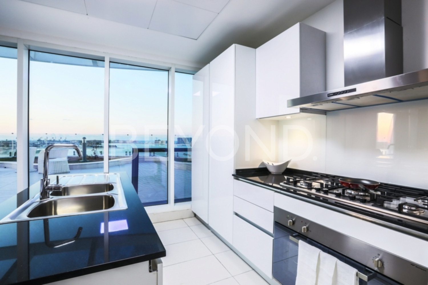 Апартмент включает в себя две террасы и панорамные окна, две спальни, каждая из которых снабжена собственной ванной комнатой и гардеробной, а также просторную кухню-гостиную площадью 38 квадратных метров. Кухня полностью оснащена европейской техникой.