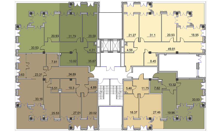 Яркая дизайнерская отделка холлов, многоуровневая подсветка, панорамные лифты OTIS